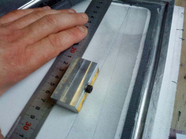 36. The wing is vacuumed together between the original mould (bottom) and second mould (with the coarse outer surface) (top). After 6 hours it is removed, excess epoxy is removed with methanol. The LE edge and tips are trimmed to the finish. The TE edge is cut to the finished size using a template.