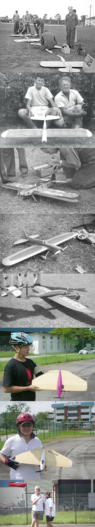 8. Here's Norm Kirton at Singapore, flying his Dimpled Dumpling No. 2 that was finished just in time for Norm to take with him to the Singapore Nationals. At the inaugural Vintage "A" race in Singapore Norm won one of the heats, but suffered from an undercompressed engine tune in the final. |