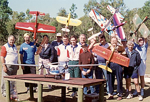6. Vasiliy Kromin was a member of Thunderbirds around 1995 - 1998. He is pictured here with the Antonov scale model he flew into second place at the 1996 World Champs for control line, held in France. Apparently Vasiliy's son damaged the starboard wing of the Antonov just prior to the World Champs, but like a true champion Vasiliy got the necessary repairs done without damaging his son! Vasiliy then went on to win the Queensland State Champs in September with the same model. 7. Group photo of the Thunderbirds. From the left are Ron Morrison, then Wayne Jackson, Ron Chernich (face hidden), John Raymond, Shaun Edgerton, Vasiliy Kromin, Ross Duncan, Colin Cater, Vasiliy's son, an unknown person (in background behind arm), Frank Sutherland, Rodger Adams, Mark Luchterhand, Ray Bucholz, and Van Richards-Smith. You can see an enlarged view of this picture here. |